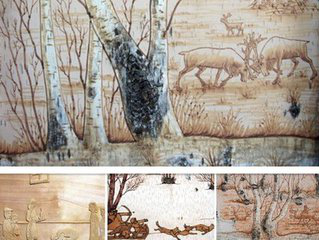 樺樹皮畫是樺樹皮工藝品中重要一種,它從簡單適用的生活必需品中脫穎而出,成為滿族鄂倫春、鄂溫克、達斡爾、赫哲等北方狩獵民族精神文化特殊需求的用品。樺樹皮畫是用樺樹皮為繪畫材料,運用樺樹皮天然形成的紋理、樹節(jié)為繪畫元素,利用獨特的繪畫工藝和技術繪制的以反映游獵民族社會生活為內(nèi)容,體現(xiàn)游獵民族思鄉(xiāng)情懷的工藝美術品。樺樹皮畫主要使用揭皮手法和碳化工藝來進行創(chuàng)作,崇尚自然和環(huán)保理念。自然古樸、不可復制、裝飾性強和游獵民族的民族特性,是樺樹皮畫的幾個突出特點。