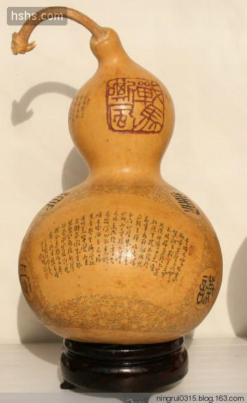 葫蘆雕集繪畫、書法、篆刻藝術于一體,傳承和發(fā)展了我國傳統(tǒng)“葫蘆文化”。甘肅的雕刻葫蘆最早出產(chǎn)于蘭州,距今約100多年,據(jù)說早期的蘭州雕刻葫蘆比較簡單,對葫蘆不會做刮皮、磨光等加工處理,也不填色;只是在葫蘆表皮雕刻出山水、風景或戲劇人物,作為兒童的玩具,在街頭巷尾出售。到了清代光緒年間,秀才蘭州人李文齋對葫蘆雕刻工藝做了改進。他針對當時雕刻表面粗糙、題材單調(diào)的弊端,首先將葫蘆原生表皮刮去、磨光,并用鏹水混合燃料,染成紅黃二色,是雕刻的景物不易脫落;其次,擴大圖案創(chuàng)作題材,在原有山水、花草等圖案基礎上,增加了如《桃花源記》、《蘭亭集序》、《竹林七賢》等歷史文化和神話故事,形成了圖文并茂的題材格局;最后是在雕刻工具上采用了以針代刀,使圖案形象更加情景交融,栩栩如生。其雕刻葫蘆的特點主要是求其意態(tài)之美,追求神似;人物寥寥數(shù)筆,山水花卉濃淡相宜,形神兼具,求其風雅;題款文字、細如蚊足,點綴成行,瀟灑自如。