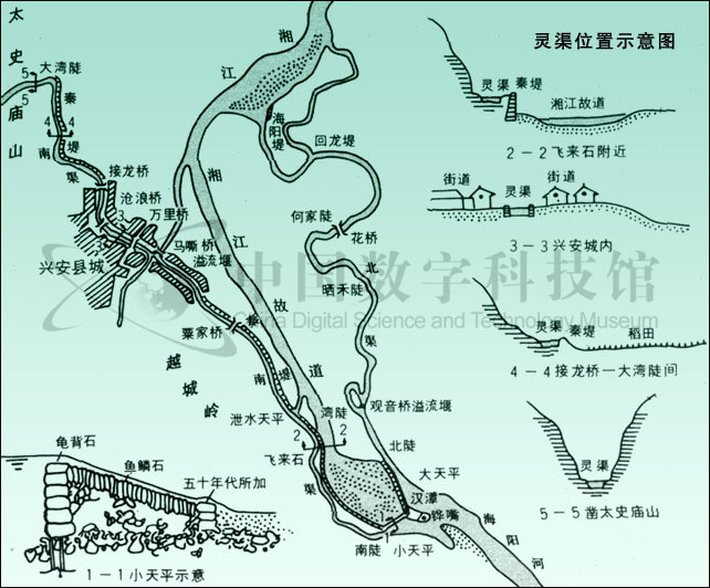 靈渠,又名零渠。以其曾部分利用靈(零)河水系的原有河道,故名。因開鑿于秦,一名秦鑿渠。又因位于今廣西興安縣城附近,故近代或稱之為興安運河。靈渠是一條連接湘江與漓江的人工渠道,主要由鏵嘴、大小天平石堤、南渠和北渠等工程構(gòu)成。鏵嘴是修建在湘江中的分水壩,用巨石疊砌而成,前銳后鈍,形似犁鏵,這是引湘入漓的關(guān)鍵工程,它有效地使湘江一分為二,一支順南渠入漓江,一支沿北渠回流入湘江。南、北渠總長三十四公里,是靈渠的主體結(jié)構(gòu),是貫穿湘、漓二水的通道。在鏵嘴尾端還筑有“∧”字的大小天平石堤,起著蓄水、溢洪,調(diào)劑水量的作用,能保證整個工程發(fā)揮正常的效益。
