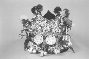 繡花帽由里外兩部分組成,素有“制做繡花帽,先做好襯套”之說(shuō)。即先按兒童頭徑大小制襯套,做法較簡(jiǎn)單,用染過(guò)的家織布做里襯,鋪上薄棉,外層為紅綢面,用線依次納緊,以防棉花下滑,縫成筒狀后,頂部用同樣的材料剪成四方形,與上部帽沿結(jié)構(gòu)相同即成。后部分較前部分復(fù)雜,先將染過(guò)的兩層家織布粘牢,表面貼上各色緞面,顏色自定。把圖樣拓在緞面上,剪下形狀不同的6片材料,把喜愛(ài)的圖案描繪在上面,接著用紡車紡出6根各4米長(zhǎng)的棉線,用吊砣逐根旋轉(zhuǎn)纏繞白色呢絨線,經(jīng)濃縮,每根僅得到1米左右線料,將這制好的精線按圖案盤弄,后以花針固定,再輔以其他色線刺繡成圖案點(diǎn)綴其間。把繡好的6片材料組合到襯套上,各片邊沿用黑白兩色線交替鎖邊,帽口用黑金絨布滾邊。此時(shí),帽頂?shù)模吨患饨怯貌噬€制做成圓球裝飾,外面四角下面懸吊白色珍珠串,末端垂著布制五角星。帽的周邊釘上銀制品,最后鑲上反光小圓點(diǎn)飾物似天上星星般光亮,給本就精致美觀的繡花帽增添了一道靚麗色彩,繡花帽就這樣在侗家女的手中誕生了。