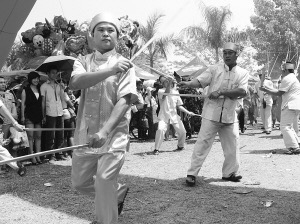 今年潑水節(jié)期間,景洪市嘎灑鎮(zhèn)傣族民間藝人進(jìn)行武術(shù)表演