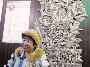 在展廳里,幾位來自黑龍江的手工藝人還現(xiàn)場(chǎng)展示了魚皮制作技藝。64歲的劉升從事魚皮制作已近20年,被評(píng)為黑龍江省工藝美術(shù)大師。她告訴記者,赫哲族過去主要用魚皮制作衣服,現(xiàn)在則用魚皮制作各種工藝品、小掛飾。在她身后,掛著一張長兩米多、寬約1.5米的魚皮畫《還魂薩滿》,展示了赫哲族神話傳說中的圖景,有薩滿、有森林、大鳥和各種圖騰,充滿了原始而神秘的氣息。劉升說,這還只是未完成的作品,但已用了3000多張大馬哈魚皮。