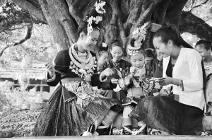 陸婷(右一)與當(dāng)?shù)乩C娘交流侗繡技藝。
