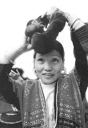我們來到廣西龍勝各族自治縣和平鄉(xiāng)黃洛紅瑤寨時(shí),還沒有進(jìn)寨,就看見三三兩兩的婦女在河水清清的河邊洗頭。她們梳洗著清亮的發(fā)絲,1.6米左右的頭發(fā)又長又黑,飄飄灑灑。長發(fā)是紅瑤女的一大特色,紅瑤有世代相傳的蓄發(fā)、護(hù)發(fā)、梳妝發(fā)型的秘方。紅瑤女十二三歲開始蓄發(fā),長到一定的長度可以剪下珍藏。等到30歲左右,就可以和秀發(fā)一同盤起。