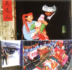 在花瑤同胞心中,沒有什么比人丁興旺、族群繁衍更加重要的了,所以他們常常把生孩子看得比結(jié)婚還要重,并要在孩子出生的第三天舉行熱烈盛大的誕生禮,稱之為“打三斗”。打三斗的禮儀,新奇、熱烈、繁縟而有趣,歷時兩天一晚。是對嬰孩、對主家的道賀,也是對寨子新添人丁的祝福。