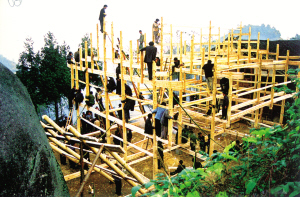 花瑤同胞修建新屋,至今沿襲著奇特古老的巫風(fēng)。對于宅基地的選擇要請地仙擇地,幫助選向和挑選動工日期。待三柱或五柱一扇的木架子做好后,豎架上梁的那天,全寨的親鄰都會主動來幫忙。用繩子拉的、用叉子撐的、用肩膀頂?shù)摹⒂媚鹃城玫?、用雙手推的,各居各位后,一聲喊起,—扇木架瞬間立于宅基上了。