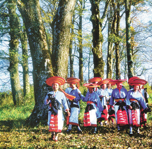這是一個特別愛美的民族。男人們著裝瀟灑隨意,頭纏黑白相間的方格頭帕,倍顯英俊。女人們則身穿黛藍色對襟長衫,鑲著的紅布邊和紅布扣純?yōu)檠b飾。下著素艷相融的花裹裙,腰纏五顏六色的腰帶,頭上再配一個后面吊有長長彩須、狀似倒扣斗篷的火紅頭巾,把個茫茫綠野點綴得山花爛漫、如畫如詩。