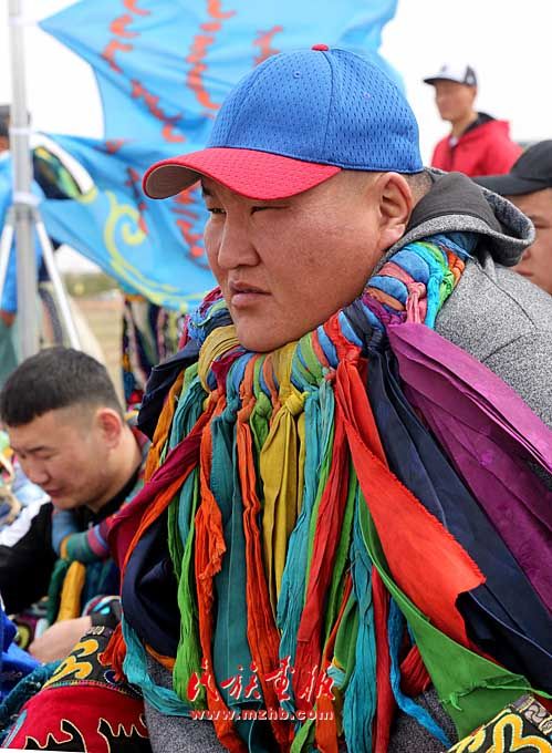 巴音昌呼格草原舉行。圖為被授予“將嘎”(彩帶)的鄂爾多斯搏克們