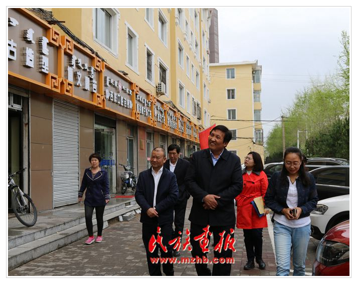2017年5月3至4日,內(nèi)蒙古自治區(qū)民委副主任薩楚日勒圖(前左二)、語文處處長曹雙喜(前左一)檢查呼和浩特市的蒙漢雙語牌匾情況(民族畫報資料)