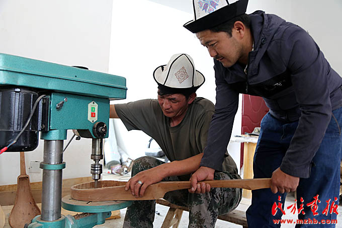 這間工作室的主人叫阿吉?jiǎng)e克·買買達(dá)洪,主人恰巧有事外出,他的弟弟,年輕朝氣的吾蘭別克張羅著給記者們當(dāng)起了翻譯。正忙活著打磨樂器的小伙叫木沙,今年31歲,問起庫姆孜的制作工藝,他才把頭抬起來,笑著說:“我做這個(gè)十年了。一把庫姆孜,往往琴身是杏木,蓋子是松木。杏樹、松樹木切割后放在干燥的地方,一兩年后才能用?!睅炷纷斡腥?,琴弦以前用動(dòng)物的腸子手工自制,現(xiàn)在有的工匠開始使用現(xiàn)成的弦。判斷庫姆孜手工藝人手藝高低的關(guān)鍵何在?木沙解釋說,“要看彈出來的聲音。木頭的原料不同,出來的聲音也不同?!边@個(gè)回答似乎也隱藏了手工藝人的絕活所在,可意會(huì)不可言傳的技藝,往往在一代代的工匠手中以師徒親授的方式傳承。