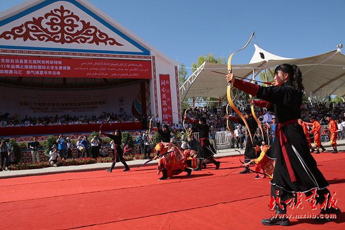 射箭是游牧民族在過去的游牧生活中必會(huì)的生存本領(lǐng)之一,哈薩克族的射箭也是傳統(tǒng)的體育競(jìng)技項(xiàng)目。圖為阿克塞之鷹2017年絲綢之路騎射國(guó)際大學(xué)生邀請(qǐng)賽上,學(xué)生的射箭展示
