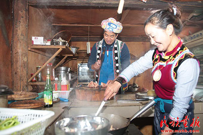早上,老姆登村73歲的怒族老人斯普早早起來(lái)招呼兒子郁伍林、兒媳魯春花:“春節(jié)快放假了,客棧的生意會(huì)忙得不可開(kāi)交,趁著現(xiàn)在客人不多,家里人先吃一頓團(tuán)圓飯吧?!彼蛊绽习樵缒赀^(guò)世,7個(gè)兒女中老五郁伍林在身邊照顧她。“過(guò)去在春節(jié)才能吃上一頓好飯菜,也要準(zhǔn)備很長(zhǎng)時(shí)間,現(xiàn)在每天都有好吃的,天天在過(guò)年,多虧了黨的好政策?!闭f(shuō)起今天的幸福生活,生在舊社會(huì)的斯普感慨萬(wàn)千。
