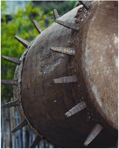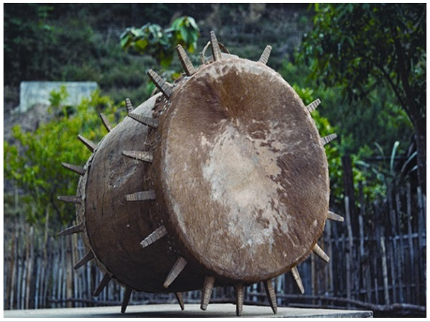 民族文化宮博物館藏基諾族木質(zhì)皮鼓,鼓面直徑55厘米,高88厘米,長約130厘米,20世紀(jì)八十年代征集于云南省西雙版納州景洪縣基諾鄉(xiāng)。鼓身為木質(zhì),呈圓柱形,兩端對(duì)稱。鼓有兩面,用牛皮蒙制。兩端鼓面邊緣各環(huán)繞嵌有花紋的上方下錐形的木棍(一側(cè)17根,另一側(cè)為20根),木棍長15厘米。鼓身兩側(cè)有方形孔,為鼓的音孔,上部有兩個(gè)把手,用于系繩懸掛木鼓。因鼓面兩端邊沿嵌有數(shù)十根鼓釘,形似太陽放射出的光芒,也稱為“太陽鼓”。