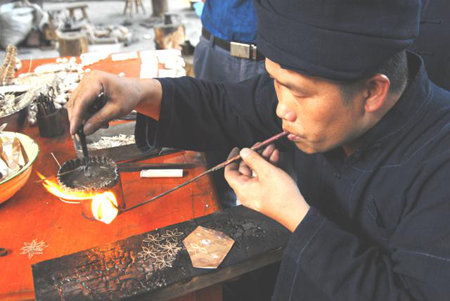 錘打:將熱銀錘打成四方形長條或圓柱狀細(xì)條,再根據(jù)制作需要,做成片形或條形。