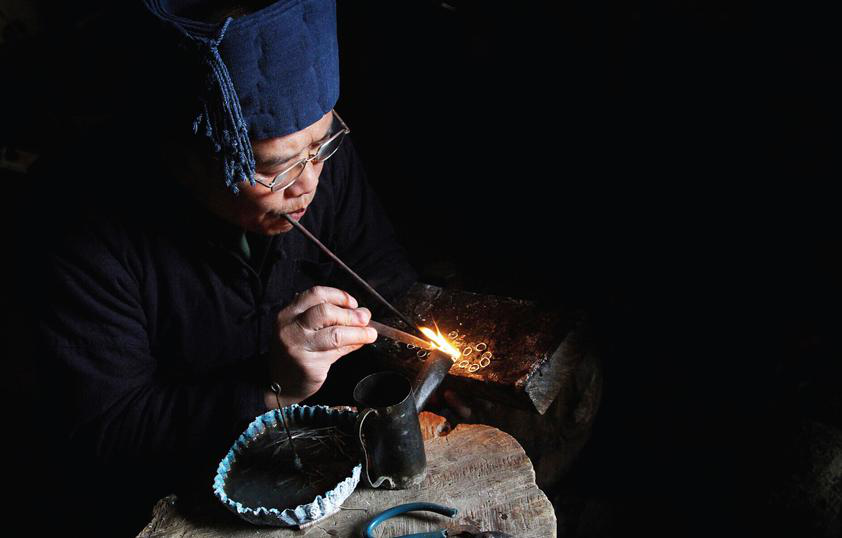 銀飾鍛制是苗族民間獨有的技藝,所有飾件都通過手工制作而成。銀飾的式樣和構(gòu)造經(jīng)過了匠師的精心設(shè)計,由繪圖到雕刻、制作有30道工序,包含鑄煉、捶打、編結(jié)、焊接、洗滌等環(huán)節(jié),工藝水平極高。