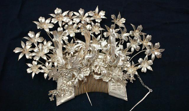 苗族銀飾鍛制技藝歷史悠久,先后經(jīng)歷了從原始裝飾品到巖石貝殼裝飾品、從植物花卉飾品到金銀飾品的演進(jìn)歷程,傳承延續(xù)下來,才有了模式和形態(tài)基本定型的銀飾,其品種式樣至今還在不斷地翻新,由此形成的飾品鏈條成為苗族社會演進(jìn)的象征之一。貴州省雷山縣、黃平縣、劍河縣、臺江縣和湖南省鳳凰縣五個地區(qū)的苗族銀飾鍛制技藝已入選國家級非物質(zhì)文化遺產(chǎn)名錄。