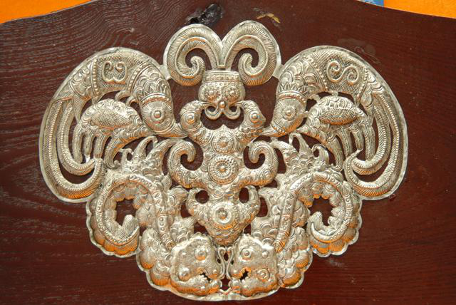 流傳于劍河境內(nèi)的苗族銀飾通常以龍、虎、昆蟲、花鳥等動植物圖案為基本素材,加上鏈狀絞花、鏨花、壓花、編花相互配合,精美中透著靈氣。劍河苗族銀飾根據(jù)造型不同,分為三個片區(qū):革東片區(qū)的項圈為鏈狀絞花式;南寨片區(qū)的項圈為板圈式;久仰片區(qū)為橫板頭式。