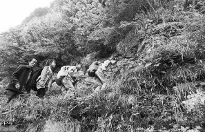 教師楊紹書和學生們在崖壁上的小路行走。
