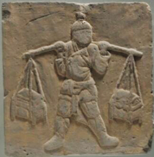 長(zhǎng)30.5厘米,寬18.5厘米,厚5厘米,呈長(zhǎng)方形。正面中間浮雕一挑擔(dān)男子,身穿右衽交領(lǐng)布衣、下著緊腿長(zhǎng)褲,扁擔(dān)由后面搭在雙肩擔(dān),被所挑重物壓彎,極富動(dòng)感。