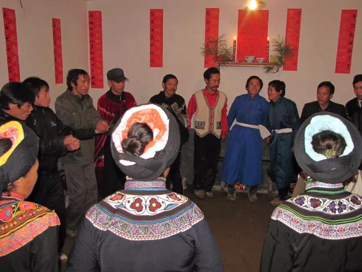 4、源自于搶婚習(xí)俗。以前,在彝區(qū)還有暴力阻攔或嘲弄接親人的習(xí)俗,這種習(xí)俗因搶婚相反,我們姑且稱之為攔婚習(xí)俗。何為攔婚?就是女方家就安排出嫁女素日的伙伴在接親隊(duì)來的路口守候著,當(dāng)接親隊(duì)來時(shí),抑或用水澆潑接親人,抑或抓粘草籽撒在接親人身上,甚至用蕁麻抽打接人,讓接親人很是吃消不下,既痛苦又尷尬。這種習(xí)俗可能源自于古時(shí)的搶婚制度。古時(shí),經(jīng)濟(jì)文化落后之時(shí),禮儀制度還不健全,存在著搶婚的現(xiàn)象,女子無法主宰自己的命運(yùn),被當(dāng)作財(cái)產(chǎn)和工具被男人搶奪。隨著禮儀制度的興起,女子的自我意識(shí)和維權(quán)意識(shí)有了增強(qiáng),她們內(nèi)心深處極力反對(duì)婚姻壓迫和搶奪,希望與男子取得平等的待遇。于是就開始出現(xiàn)了阻攔和戲弄接親人的習(xí)俗。阻攔和嘲弄接親人的方式多種多樣,也從最早的野蠻方式逐步向文明過渡。應(yīng)該說,阿買懇是攔婚習(xí)俗的延伸與發(fā)展,又折射出了搶婚的影子。阿買懇設(shè)置了幾十道盤歌的關(guān)卡,每道關(guān)卡都需要智慧和才藝,這是一種傳統(tǒng)習(xí)俗繼承中的文明發(fā)展表現(xiàn)。“阿買懇”的“懇”,除上面講的有“跳舞”、“歌舞”之意外,還有“搶”、“奪”之意。綜上所述,阿買懇蘊(yùn)含了搶婚制中深層次的文化心理積淀。