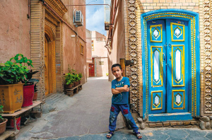 江庫爾干巷最美的門,人們都愛在此留影。上午12點(diǎn),斑駁的陽光灑在門上,瓦力小朋友跳到鏡頭前學(xué)著電影中的人物姿勢,讓我給他拍照片。