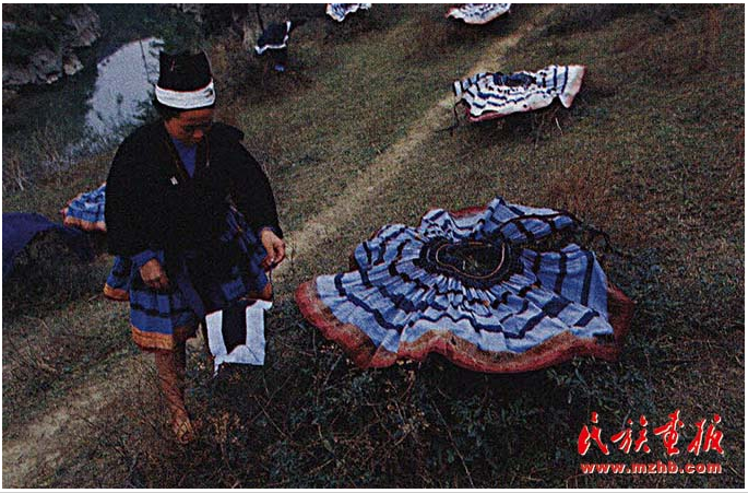 畫好的白布放進(jìn)盛有牛膠和藍(lán)靛的缸里浸染7— 10天,當(dāng)布匹染成深藍(lán)色時(shí)拿出,再放入盛有草木灰的熱水中,用灰水將粘膏脫去,清水洗凈后晾干,就成了一塊有白色花紋的蠟染布。白褲瑤婦女在白色的花紋上繡上彩色的絲線,再把三幅繡有圖案的布連成一塊4米長(zhǎng)的裙布,在裙腳邊上縫上一條手掌寬的黃色蠶絲,最后用2 條棉繩穿過裙頭勒緊,百褶裙就做成了。一條百褶裙從紡線到完成據(jù)說需要兩到三年的時(shí)間。