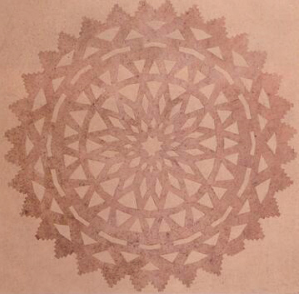 該剪紙出土于吐魯番市阿斯塔那303號墓,不僅保存完好,而且構(gòu)圖對稱、畫面均勻、線條流暢、美觀大方,可以和現(xiàn)代民間剪紙藝術(shù)相媲美。剪紙為圓形,呈土黃色,中心圖案為八角花形,依次向外為兩圈菱形花紋,交叉錯落,排列有序;再向外圈為梯形紋組成的三角形邊飾。整個剪紙圖案層次分明,變化繁復(fù),頗有韻律感。這幅剪紙為折疊后一次剪成,造型簡潔,刀法洗練,具有古樸濃郁的民間風(fēng)格。
