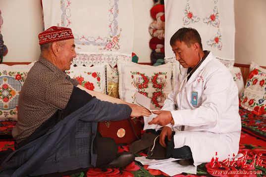 居馬泰·俄白克多年的恩師阿吾爾達(dá)·合德爾現(xiàn)在也是他的病人,這位80多歲的老人向記者說(shuō)道居馬泰·俄白克翻雪山、過冰河,無(wú)數(shù)次遇險(xiǎn),但他仍在堅(jiān)持。把我們這些患者當(dāng)作家人對(duì)待。學(xué)生時(shí)代的居馬泰·俄白克就是思想積極,熱心善良的好孩子。工作后獲得榮譽(yù)受到習(xí)總書記的接見,回到工作崗位上,很多牧民騎馬趕來(lái)看望他,他就利用這個(gè)機(jī)會(huì)向牧民宣傳黨的惠民政策、民族團(tuán)結(jié)和健康保健等知識(shí)。”