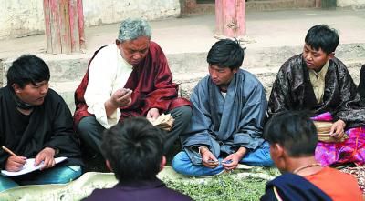 其木居曼巴(世襲家族醫(yī)生)丹松扎巴(左二)為學生講授辨認藥浴藥材的方法。劉罡 攝