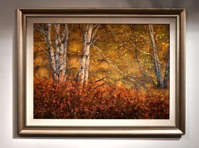 本作品表現(xiàn)的是深秋時節(jié)森林金黃,白樺樹落葉點點、露出白色枝干的景象。整體繡面用色豐富多彩,炫而不俗;針法靈活多變,層次鮮明,仿佛置身其間,給人以美的享受。
