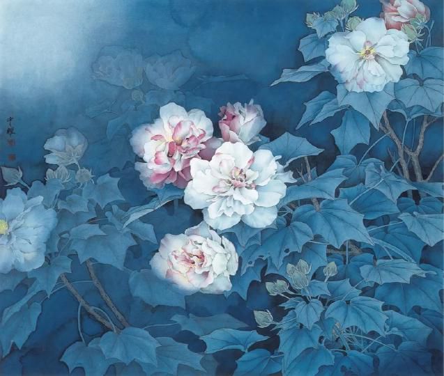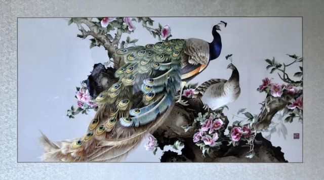 原作是畫家張玉明的工筆畫作品。一對孔雀棲息于爛漫盛開的山茶花間顧盼回首,相映成趣。整體繡面繡工精細(xì)、絲光迥動,將蘇繡精、細(xì)、雅、潔的特點表現(xiàn)得淋漓盡致。