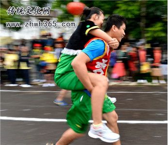 在昌江黎族自治縣一帶流行。每年的農(nóng)歷十五前后,孩子們就聚居在一空曠地,舉行村與村之間比賽??筛鶕?jù)人數(shù)來分組,每組2人(一男一女),每次由兩組進(jìn)行,實行淘汰制,男背著女或女背著男亦可,與對方互相碰撞,男女通過踢、拉、推等動作,千方百計地把對方背著的人或拉下,或把兩人分開,或倒地。在場觀看的人興高采烈,笑聲不斷,其樂無窮。