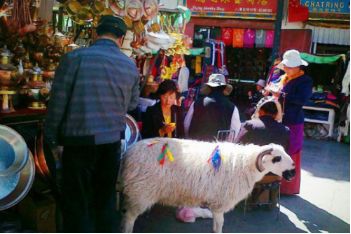 在西藏的許多寺廟及附近,常常會(huì)有單獨(dú)的、或三三兩兩的脖頸上系著紅布條沒(méi)有主人的羊只。主人把它們放生,使它們重歸自然,成為自由的羊,免去了挨宰遭殺之罪。習(xí)慣上,這些羊就叫做放生羊。轉(zhuǎn)經(jīng)人會(huì)自覺(jué)自愿給它們吃的東西,它們不會(huì)為肚子饑餓而亂躥。也許正因?yàn)槿绱?,這些放生羊才會(huì)顯得非常乖巧溫順。