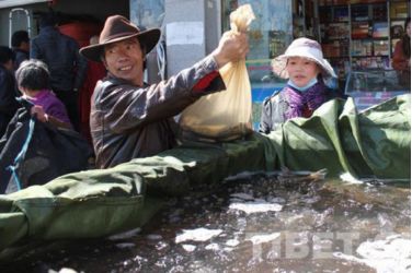 在當(dāng)?shù)厮幫跎睫r(nóng)貿(mào)市場(chǎng)可以看到,很多信眾或帶著器皿或拿著塑料口袋前往水產(chǎn)店買(mǎi)魚(yú)放生。甚至有的信眾開(kāi)著一輛面包車(chē),車(chē)廂用塑料包裹,里面裝滿(mǎn)水,載著買(mǎi)來(lái)的一整車(chē)魚(yú)前往拉薩河放生。 “薩嘎達(dá)瓦節(jié)期間,魚(yú)賣(mài)的特別快,藏歷十五的時(shí)候我們的魚(yú)都被買(mǎi)光了。”水產(chǎn)市場(chǎng)的李老板說(shuō)。
