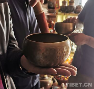 圖為一家商店中游客正在體驗(yàn)sing bowl