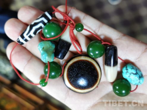 商家們一般把天珠分為幾類。第一類是印度的天珠,經(jīng)營(yíng)這類天珠的商家很少,這些珠子也主要是賣給游客,要價(jià)一般每顆在150-300元之間。第二類是臺(tái)灣天珠,經(jīng)營(yíng)者較多,多數(shù)商家將其看作普通飾品,目標(biāo)群體也主要是游客,每顆的價(jià)格在50-800元之間。第三類,也就是在那里大家常說的“真天珠”或“老天珠”,價(jià)格每顆一般從幾千元起,至幾十萬元不等。當(dāng)然,在第三類中,除了天地珠、虎牙珠等花紋形式外,天珠上“眼睛”的數(shù)量也很重要,一般地,好天珠上的眼睛越多,價(jià)格最高。在當(dāng)?shù)厣碳液娃r(nóng)牧民看來,一顆上好的九眼天珠真的是價(jià)值連城。