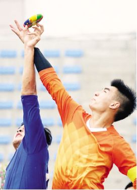 江西隊選手在混合雙蹴比賽中起腳擊球 何五昌攝