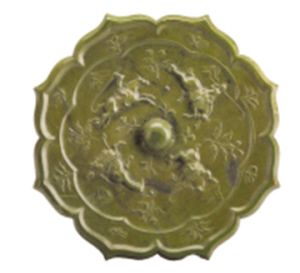 目前我國僅存三面有關(guān)打馬球圖案的銅鏡,一件為故宮博物院的傳世品,另一件收藏于安徽懷寧縣博物館,而以揚(yáng)州出土的這一面銅鏡保存最好,是唐鏡中的珍品。這枚打馬球紋銅鏡收藏于江蘇省揚(yáng)州博物館,直徑18.5厘米、厚1厘米,1965年出土于揚(yáng)州邗江泰安金灣壩工地。鏡為菱花形,圓鈕。鏡背主紋為4名騎士,有的高舉鞠杖,作搶球狀;有的俯身向前,鞠杖向下,作擊球狀;四馬馳騁,四人搶球,氣氛熱烈緊張;人與球之間襯以高山、花卉紋,顯現(xiàn)出在郊外運(yùn)動(dòng)場(chǎng)比賽的情景,更添一絲活潑的生活氣息。