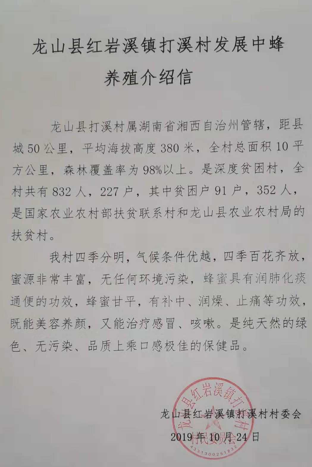 這里四季分明,氣候條件優(yōu)越,四季百花齊放,蜜源非常豐富,無任何環(huán)境污染。據(jù)湖南省湘西州龍山縣紅巖溪打溪村支部書記沈世平介紹:“我們這兒已經(jīng)有很長的養(yǎng)殖蜜蜂的歷史,環(huán)境無污染,田土少,屬于純天然養(yǎng)殖,無農(nóng)藥,利于中蜂的養(yǎng)殖,并且在2019年4月份的時候,通過農(nóng)業(yè)部及農(nóng)業(yè)科學(xué)院的專家實地考察,認(rèn)證為最佳養(yǎng)蜂環(huán)境。今年獲得鄉(xiāng)政府幫扶,規(guī)劃從龍山縣中心養(yǎng)殖合作社引進(jìn)50箱進(jìn)行集中養(yǎng)殖,明年開始分設(shè)4點(diǎn),一個點(diǎn)150箱,擴(kuò)大產(chǎn)量,并向全縣推廣。”