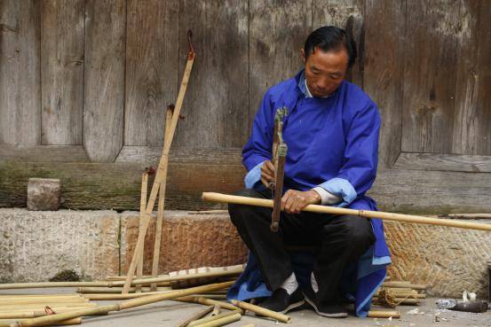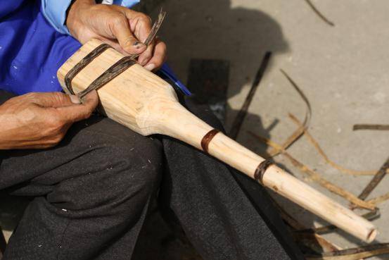 制作蘆笙大的工序有12道,再細(xì)一點(diǎn)有幾十項(xiàng)。如第一道是到山上去選竹子,拿尺子慢慢比劃,三拳的有多長(zhǎng),要很細(xì)心地選,確實(shí)可以用。取下來之后,第二道工序是拿到河邊去洗,用紗布搓。因?yàn)橹窆苡泻芏喟唿c(diǎn),關(guān)節(jié)處有很多毛,要很細(xì)致的把那些東西全搓掉。弄好之后用太陽曬,曬干曬白。第三道工序,就是取杉樹的木頭做笙斗,計(jì)劃好做三拳的是多少公分,四拳是多少公分。十二道工序,后面越學(xué)越復(fù)雜,每一道工序都很講究。
