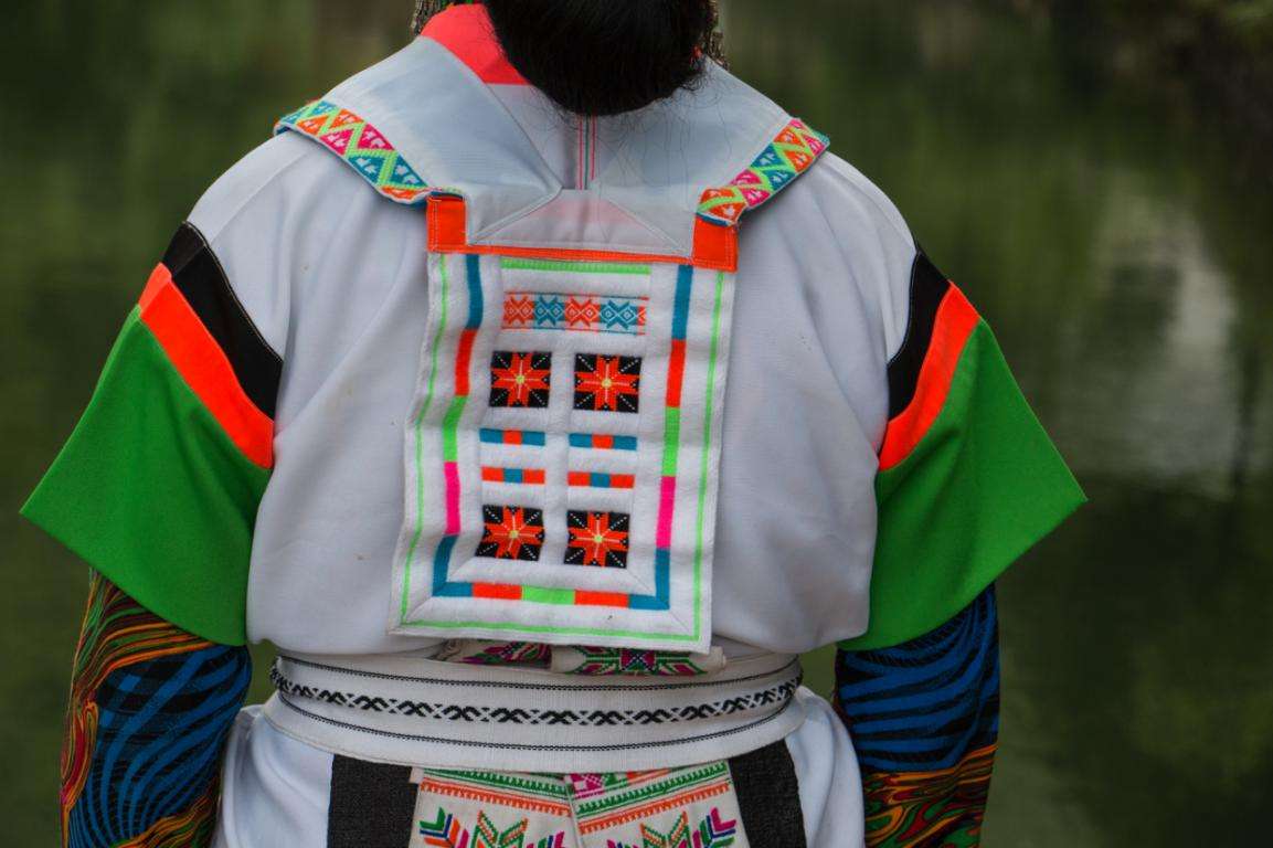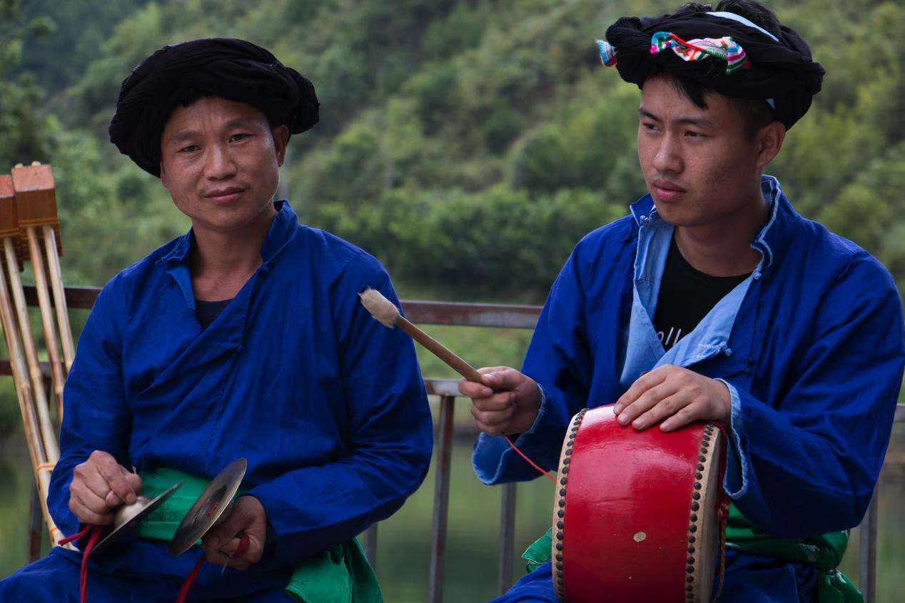 改毛村苗族村民的傳統(tǒng)服飾至今保留完好,而且現(xiàn)在村內(nèi)的苗族人都還有穿著本民族傳統(tǒng)服飾的習(xí)慣。改毛村的苗族男性一般頭戴黑色絲帕裹成的帽子,絲帕里裹有彩色絲巾。穿著藍(lán)色打底的斜襟長衫,腰部系有綠色腰帶。