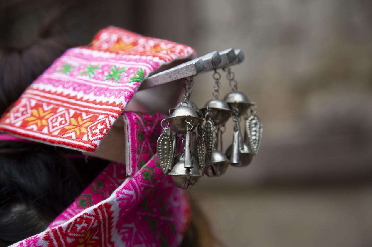 在身后可以看見(jiàn)圍腰下的藍(lán)色百褶裙,百褶裙上有波浪線條狀花紋,面積較小,百褶裙大部為藍(lán)色。女子有綁腿習(xí)俗,綁腿帶也是藍(lán)色,與服飾顏色相呼應(yīng)。女子頭飾往往以紅色布帶裹頭,用銀簪束發(fā)。