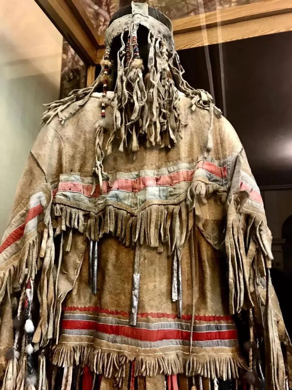 展區(qū)內還陳列著幾套保存完整的薩滿服飾,有鹿皮、獸皮、魚皮和纖維等多種材料。與國內留存的薩滿服飾不同的是其鹿角帽的制作,鹿角帽上裝飾著龜、蛇和神偶形象,頂端八岔鹿角的材料是金屬。