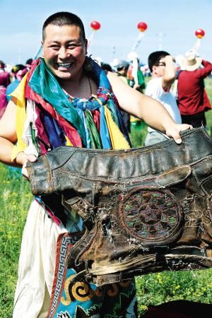 內(nèi)蒙古自治區(qū)正藍旗搏克手充滿補丁的祖?zhèn)黪右隆?巴義爾攝