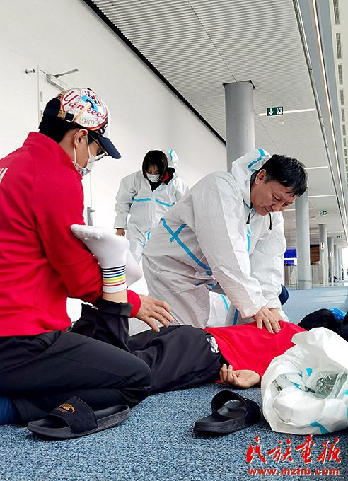 烏日根桑格利用在機(jī)場(chǎng)轉(zhuǎn)機(jī)時(shí)間,為國(guó)家柔道隊(duì)運(yùn)動(dòng)員進(jìn)行調(diào)整治療。