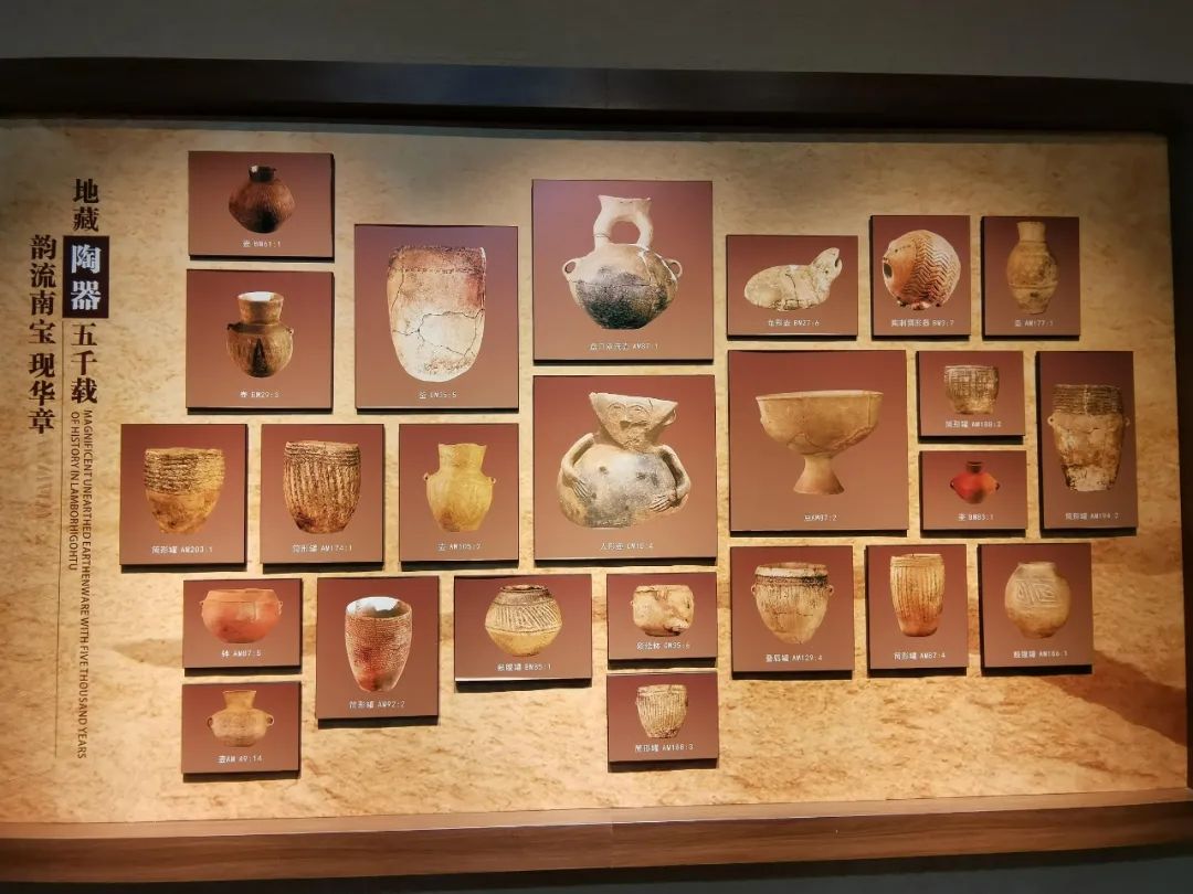 陶韻風(fēng)采;生活穩(wěn)定的南寶先民,在生產(chǎn)之余,加快了對藝術(shù)追求的步伐,接受來自周鄰?fù)谖幕挠绊?,他們開始在日常使用的陶器上面描繪圖案,形成了獨特的南寶風(fēng)格。雍容華貴的彩陶圖案,紋樣繁復(fù)的劃刻特點,宛如一面面飄揚在這里的旗幟,引領(lǐng)著南寶先民走出原始泥沼,迎接文明曙光。