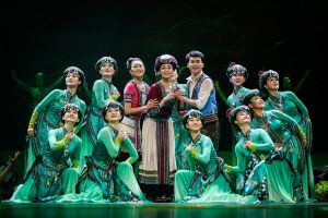 在舞劇敘事方式上,總導(dǎo)演之一董華興將民族性與現(xiàn)代性相融合,嘗試時(shí)空切換,段落重組,故事情節(jié)的倒敘、插敘,真實(shí)性與虛擬性相結(jié)合等方法?!耙魳分谱?、舞蹈語匯、服裝設(shè)計(jì)等方面都要符合當(dāng)?shù)厝罕姷纳?,接地氣老百姓才?huì)喜歡?!薄缎腋;ㄉ健房倢?dǎo)演之一馬文靜說。