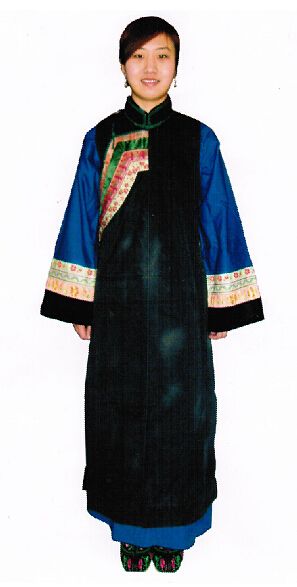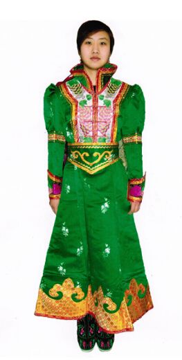 科爾沁蒙古袍款式較合身,長(zhǎng)袍下擺窄且開衩。格外注重刺繡裝飾、穿偏開襟長(zhǎng)坎肩、工藝精湛的尖頭靴和已婚婦女發(fā)髻式珊瑚頭飾等是科爾沁服飾最顯著的特征。