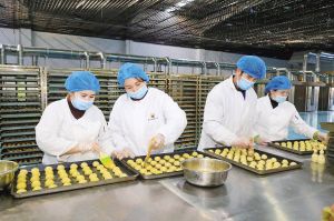 在霍爾果斯馕產(chǎn)業(yè)園里,面點師傅正在制作用于出口俄羅斯的馕。 新華社發(fā)