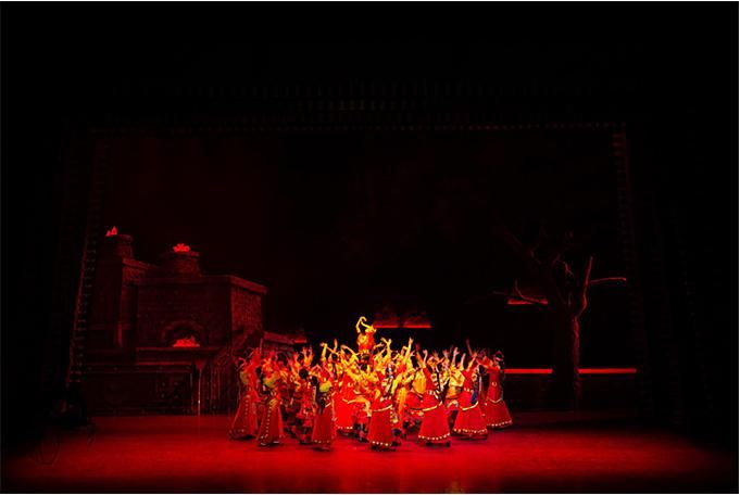 在手段創(chuàng)新上,主創(chuàng)人員在嚴(yán)格遵循南木特藏戲藝術(shù)傳統(tǒng)和戲劇原則的基礎(chǔ)上,設(shè)計(jì)了部分新的唱腔,使用了現(xiàn)代舞臺(tái)的舞美和聲光電手段,采用了26人組成的中型民族樂隊(duì),從而營(yíng)造出了全新的舞臺(tái)效果。在藝術(shù)手法上,還采用了以南木特藏戲手段表現(xiàn)西藏藏戲內(nèi)容的特殊表現(xiàn)形式,以戲中戲的重疊盡顯不同風(fēng)格的藏戲風(fēng)采,大大地豐富了表演手段和出彩看點(diǎn),為觀眾提供了巨大的想象空間。